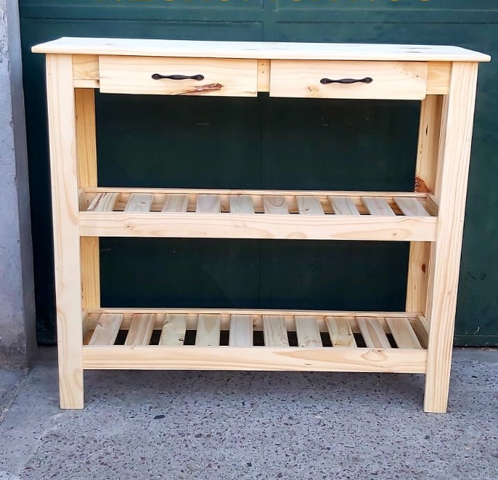 Mesa tipo desayunador de pino macizo con cajones y 1 o 2 estantes debajo. De terminacion lisa y se entrega listo para pintar. Disponible en 2 medidas de largo