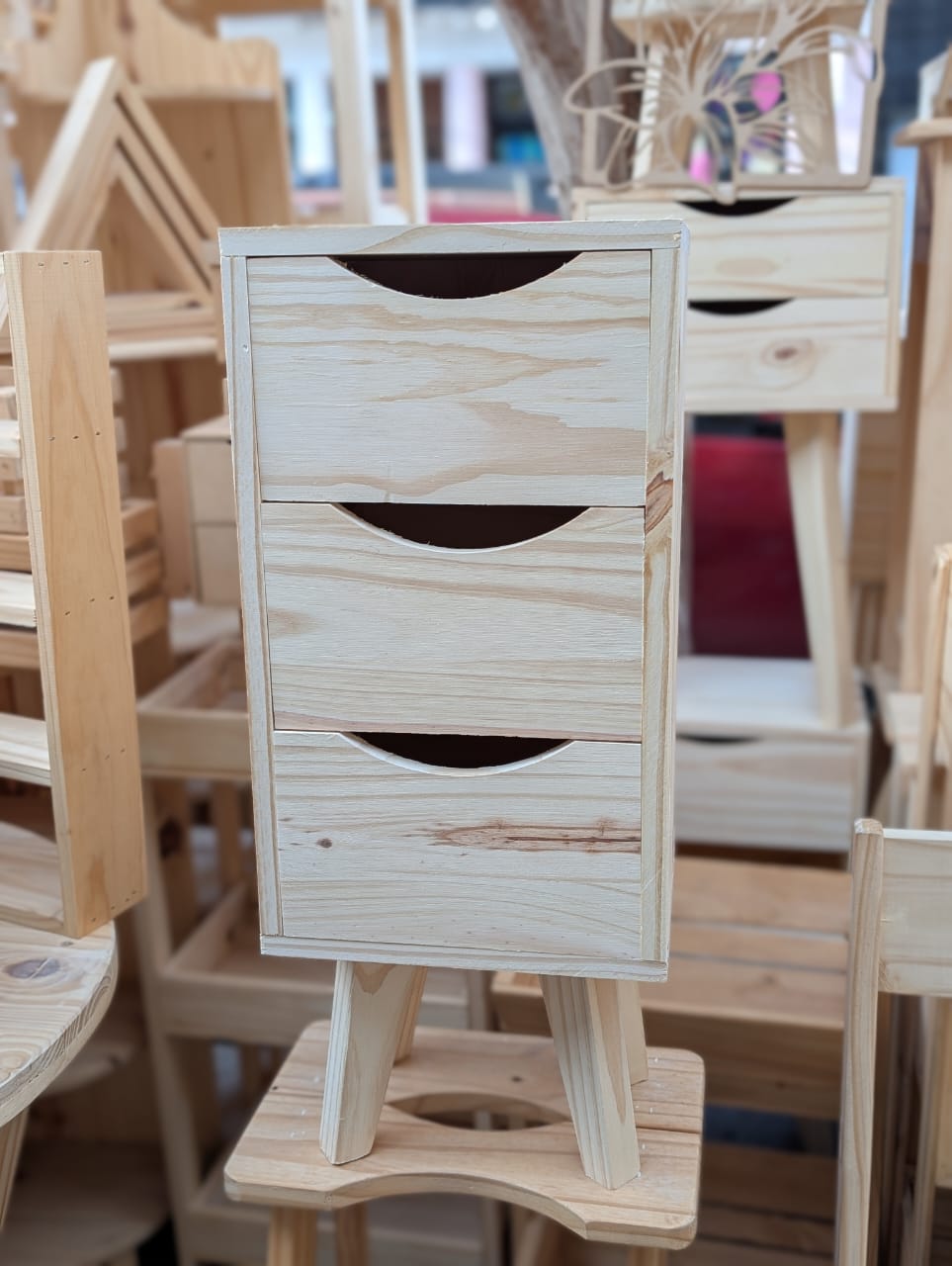 Mesita de luz estilo nordico con 3 cajones, Hecha con madera de pino maciza.